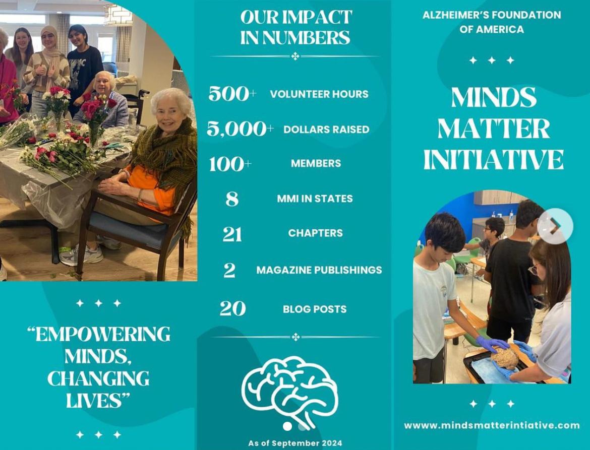 Beginning in September raised $500+ (as per my high school’s chapter) and $2365 in total towards AFA's national research and programs, specifically focusing on neuroimmune communication in Alzheimer's disease, early detection methods, and treatments for memory loss. My chapter (Green Level) was one of the top donors to the cause.