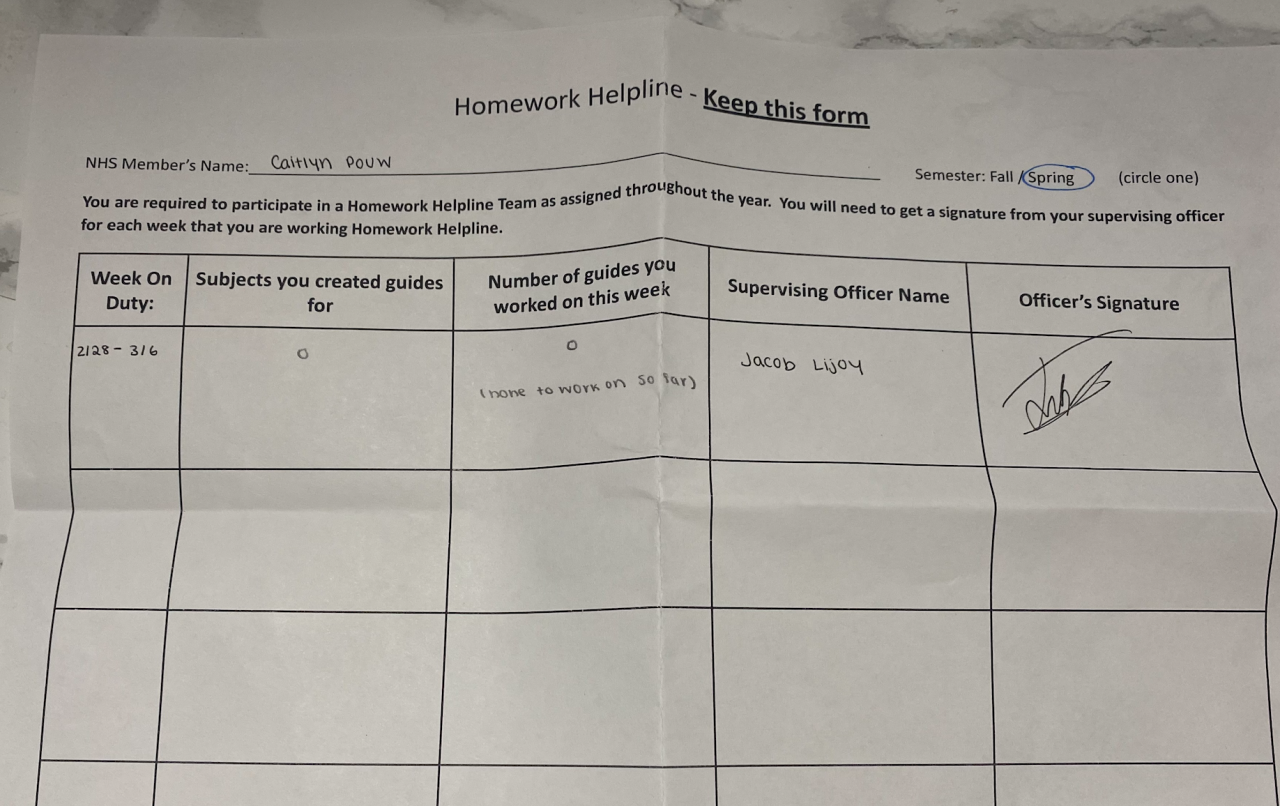 Senior - Tutoring/Homework Helpline Sheet