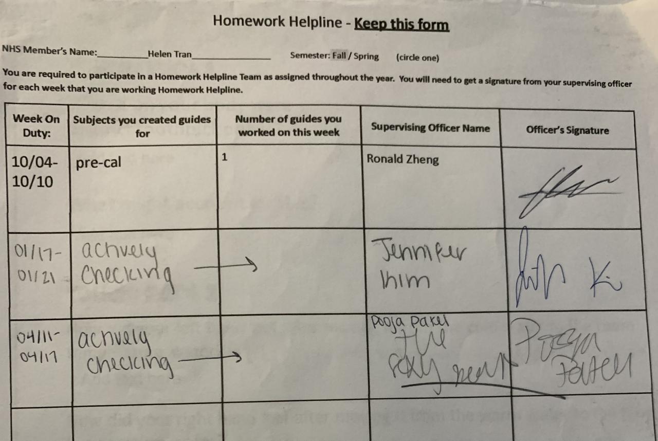 Senior - Tutoring/Homework Helpline Sheet