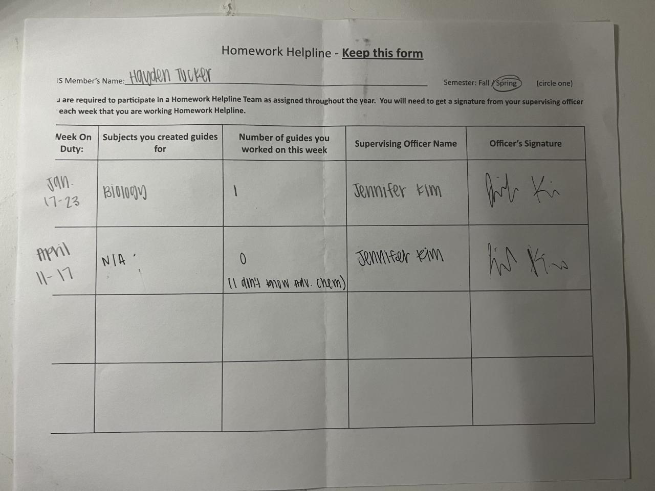 Senior - Tutoring/Homework Helpline Sheet